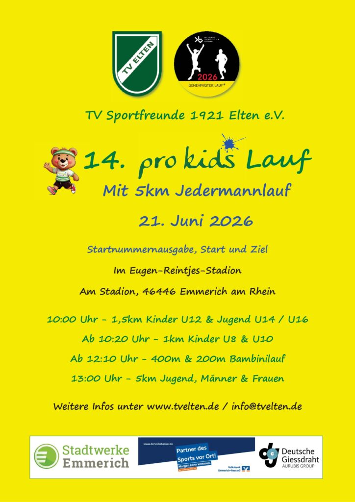 Am 21.06.2026 pro kids Lauf im Eugen-Reintjes-Stadion Emmerich am Rhein.